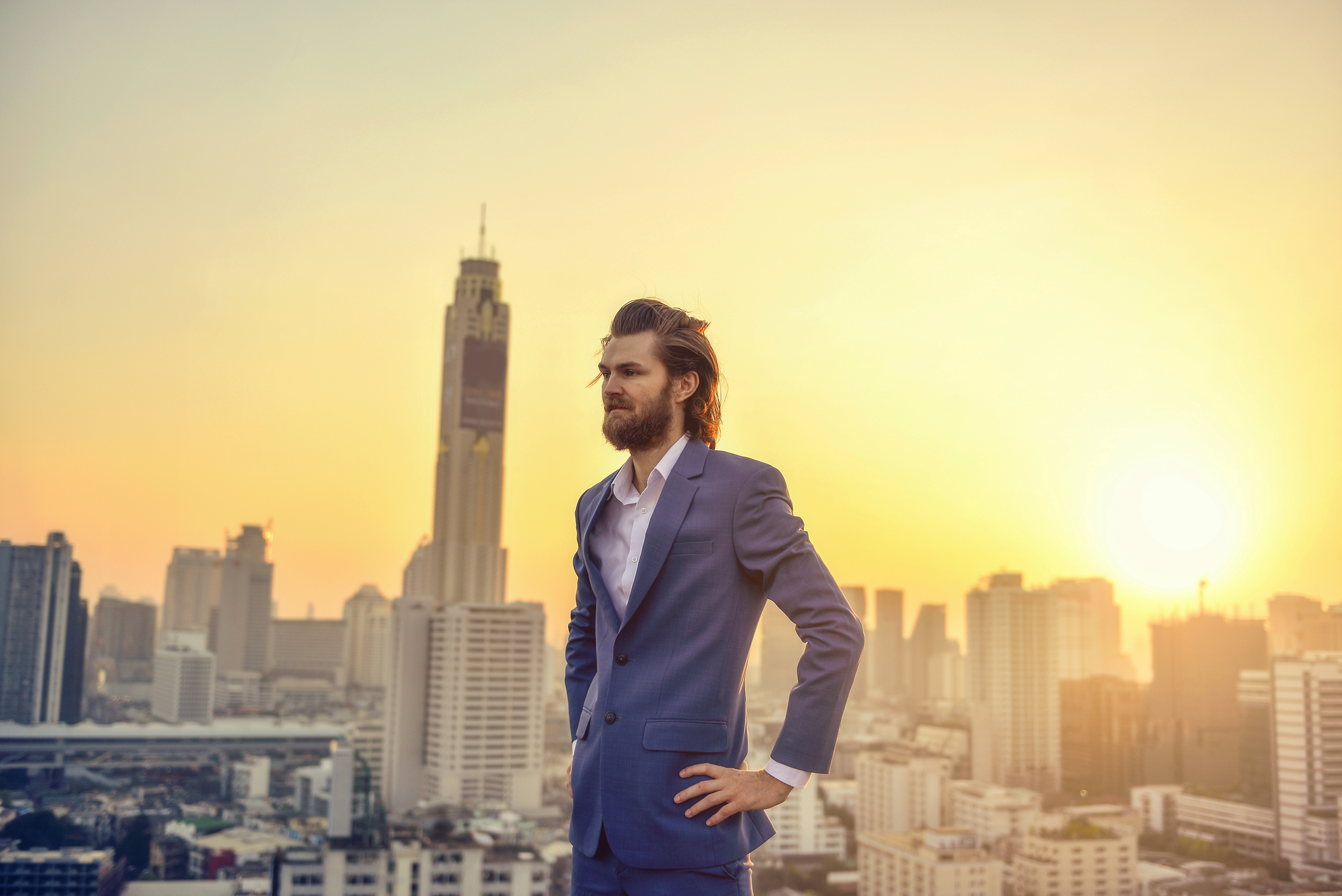 Western businessman looking at Bangkok city at sunset